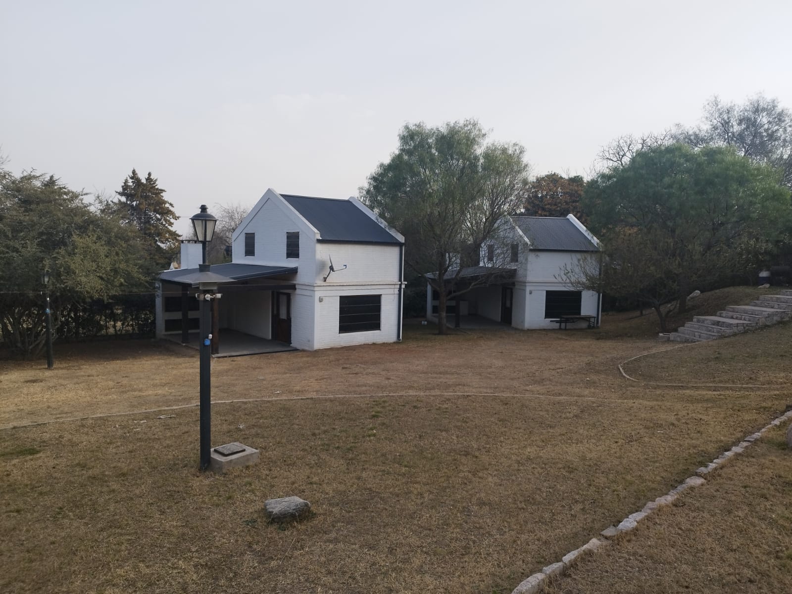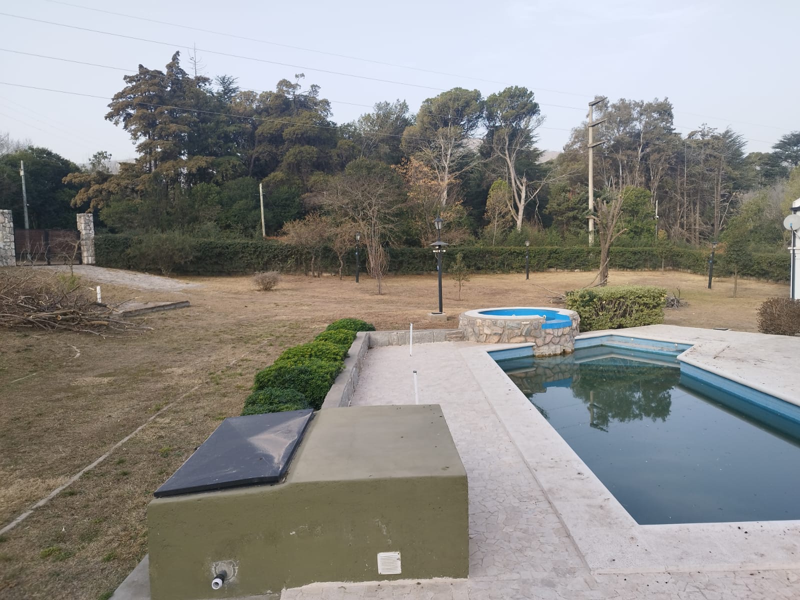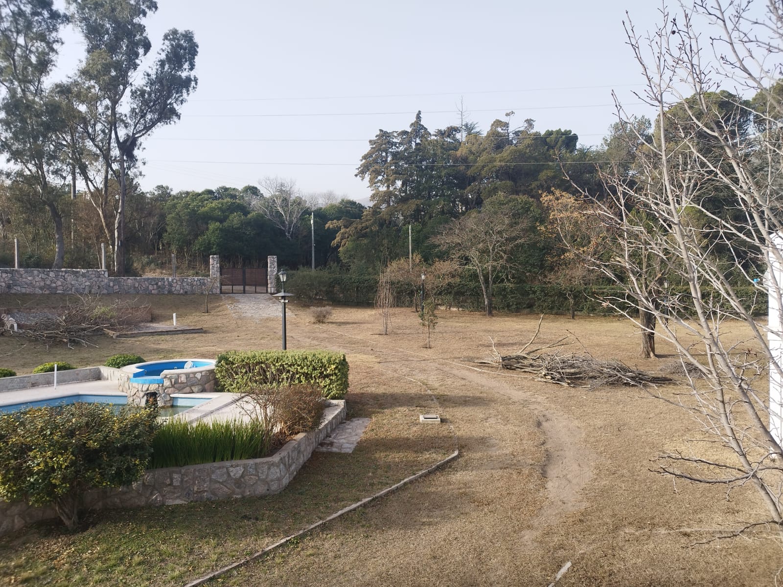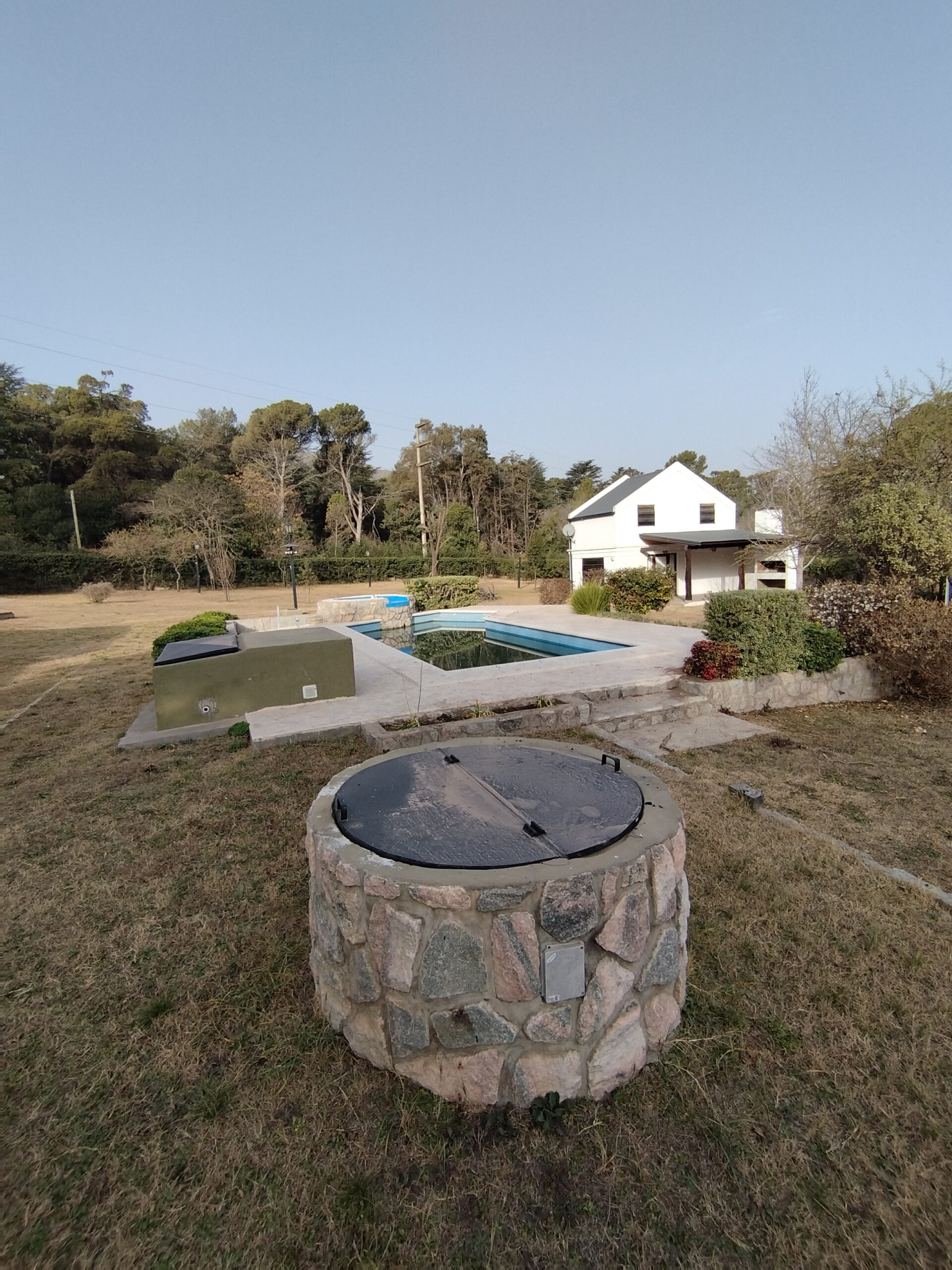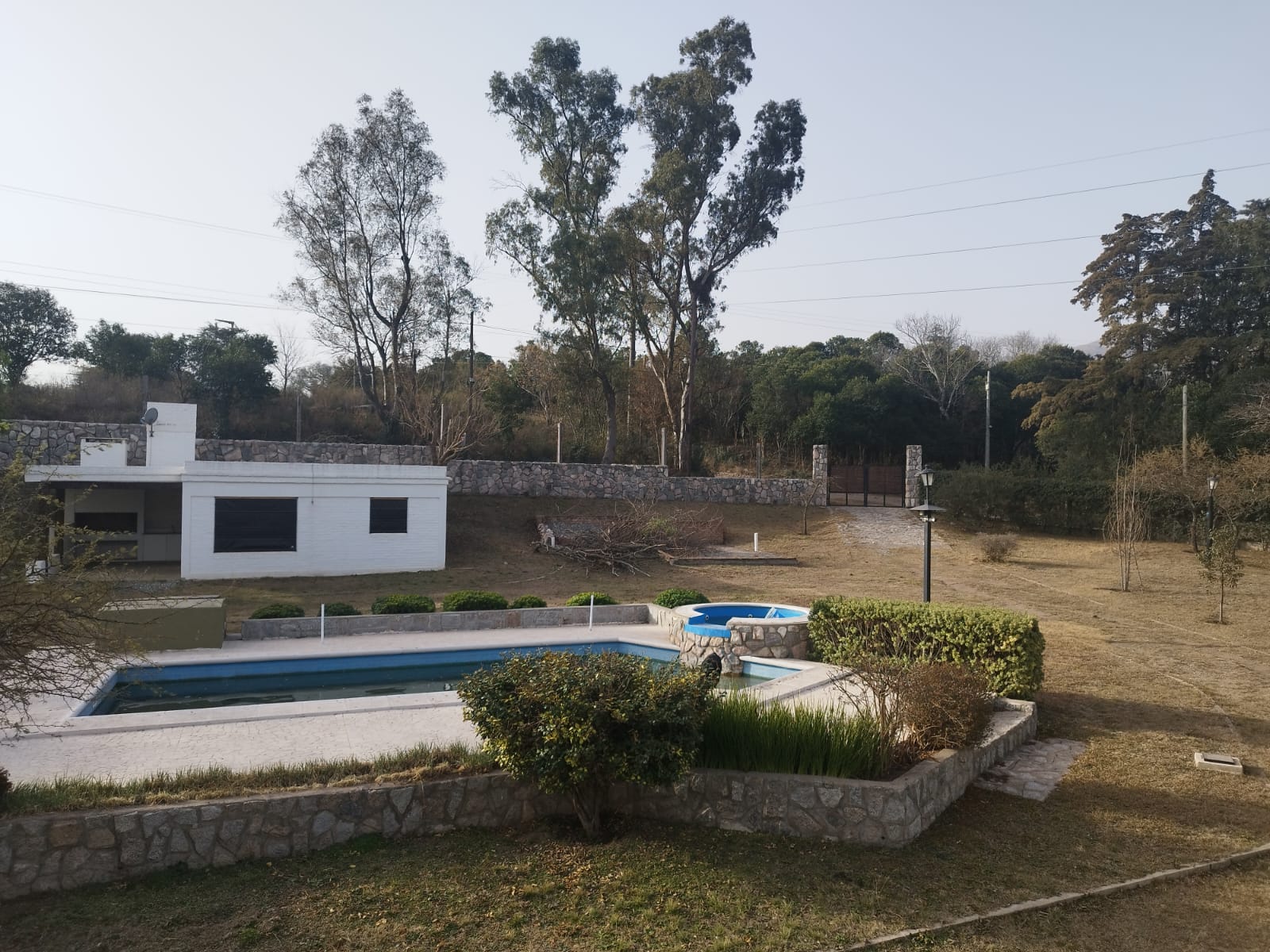 * Cerco perimetral total, de frente con base de piedras naturales cementadas con 80 cm de cimientos, y alambrado olímpico con postes de quebracho. En sus laterales, alambrados olímpicos con base de panel de cemento premoldeado.